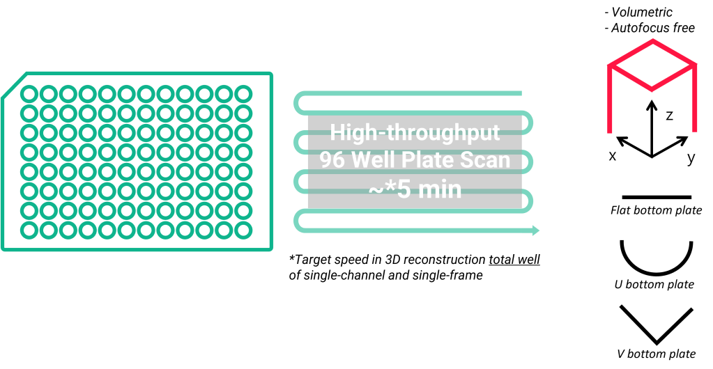 - Scanning flat, U-bottom and V-bottom 96 wells in 3D per 9 minutes (current record)